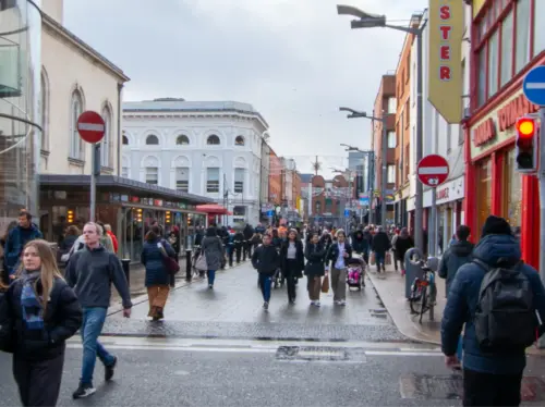 Grafton Street – Dublin's premier shopping street with luxury brands, department stores, and street performers creating a lively atmosphere