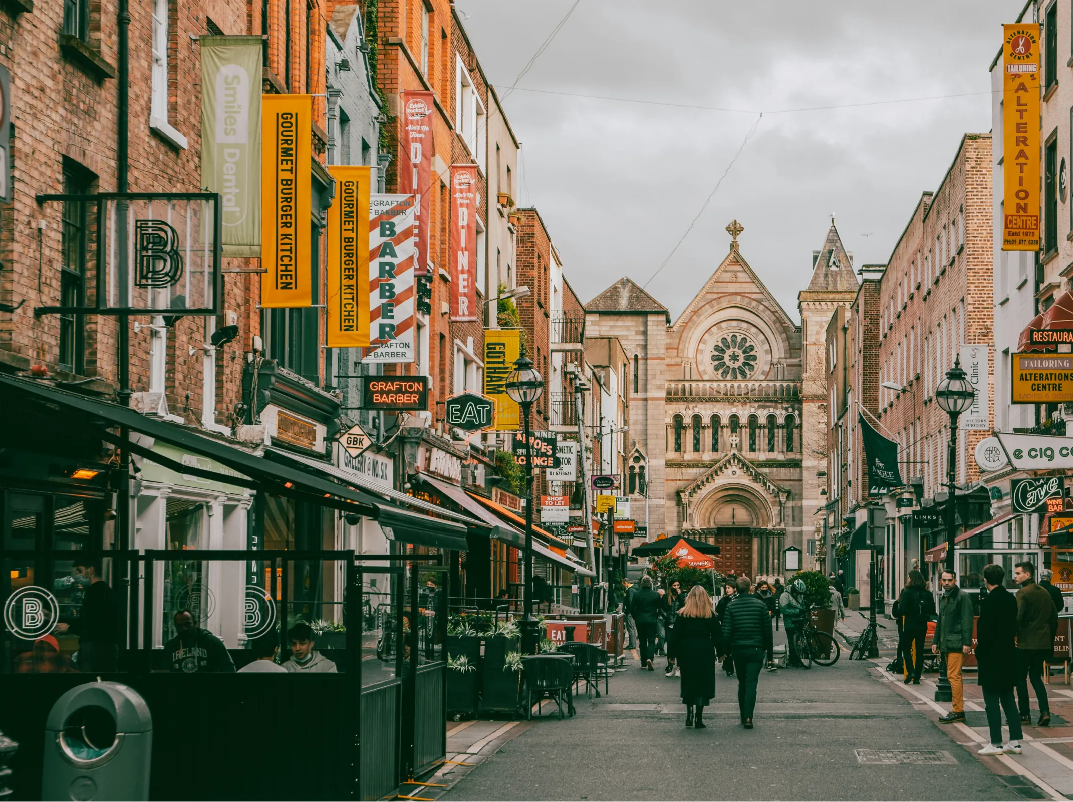 Grafton Street – Dublin's premier shopping street with luxury brands, department stores, and street performers creating a lively atmosphere