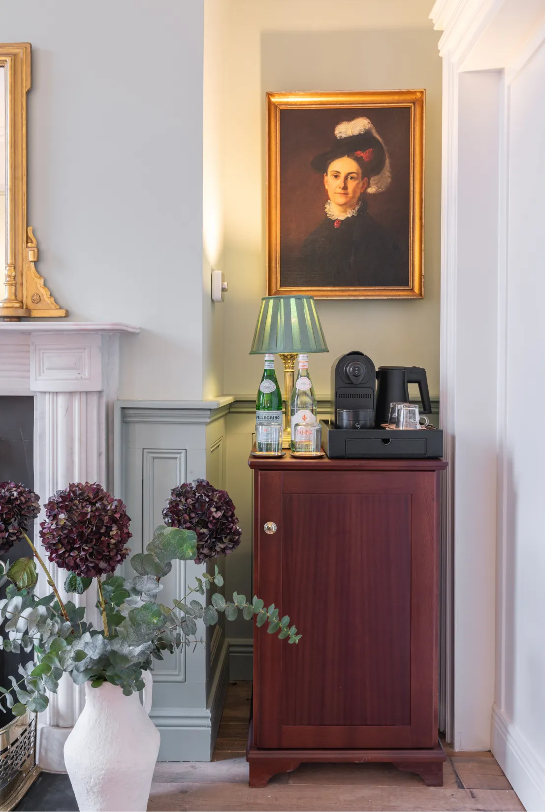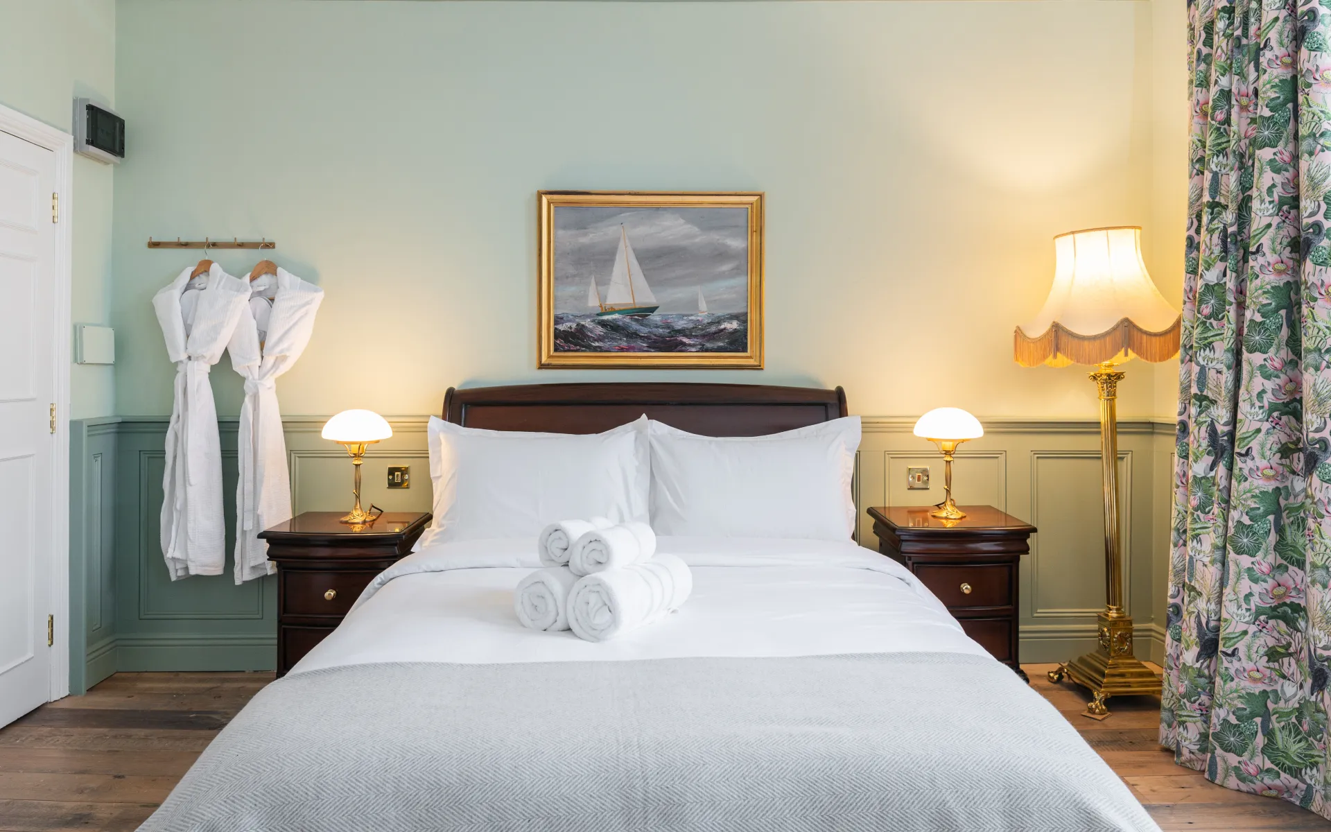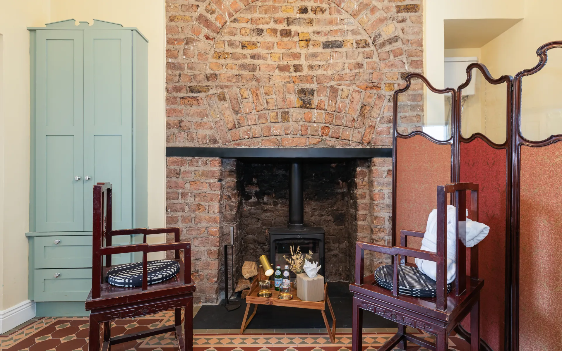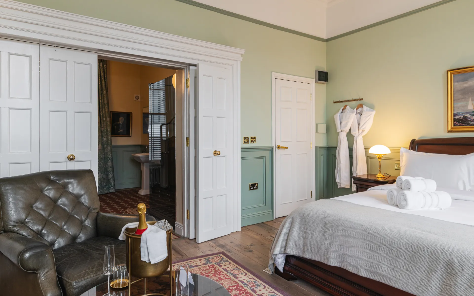 This suite features a generous bedroom with a comfortable double bed dressed in crisp white linens, alongside a separate seating area centred around an original fireplace. Thoughtful details, heritage colours and classic furnishings create a warm and inviting atmosphere, ideal for longer stays or guests who appreciate extra space.