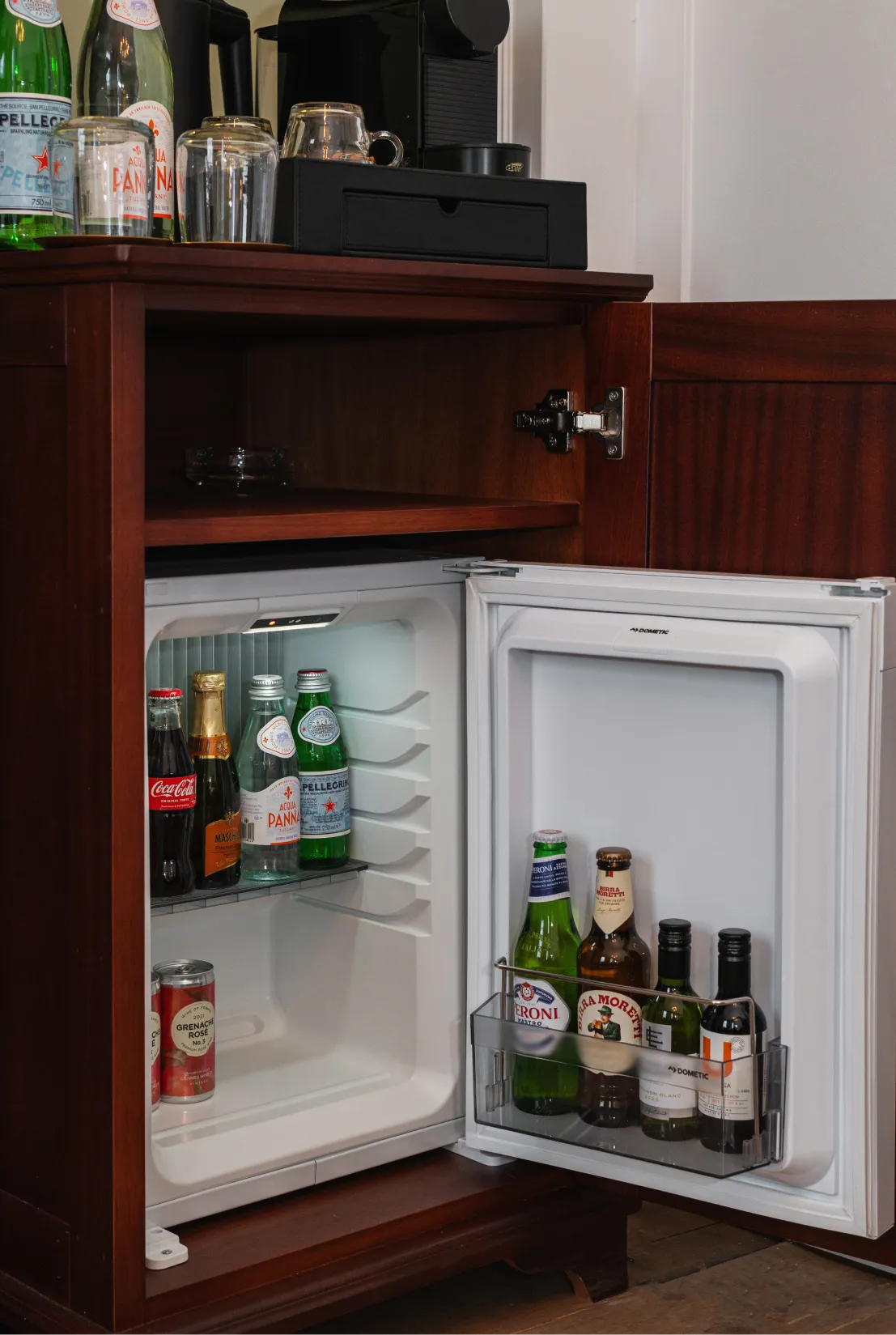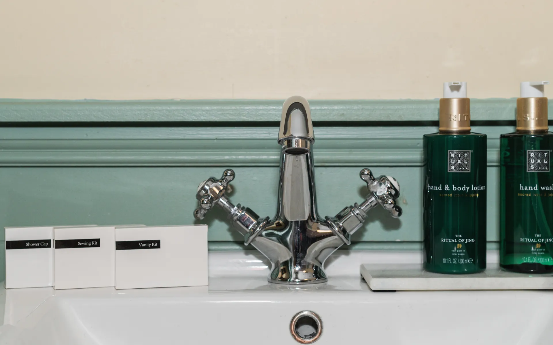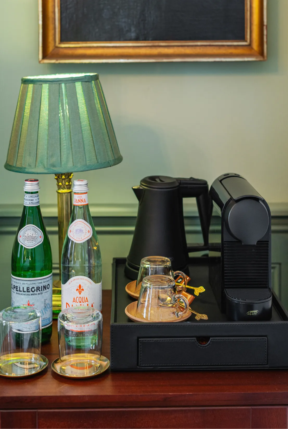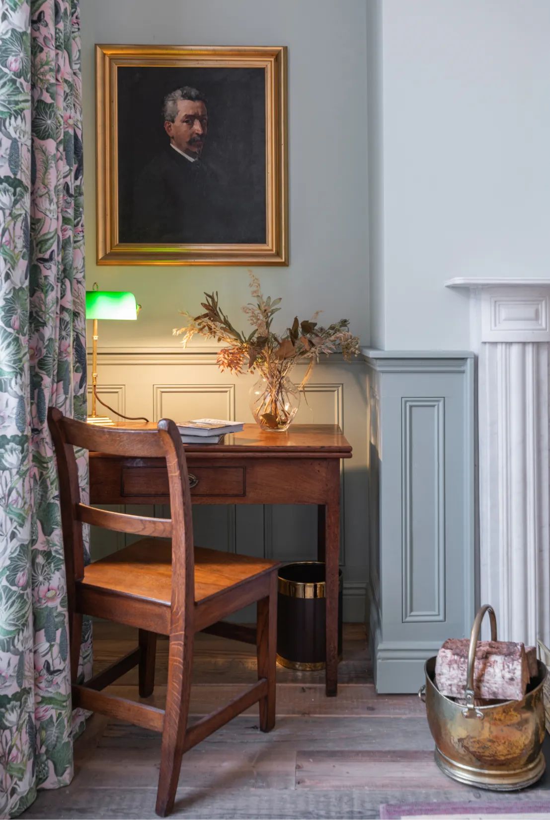 This suite features a generous bedroom with a comfortable double bed dressed in crisp white linens, alongside a separate seating area centred around an original fireplace. Thoughtful details, heritage colours and classic furnishings create a warm and inviting atmosphere, ideal for longer stays or guests who appreciate extra space.