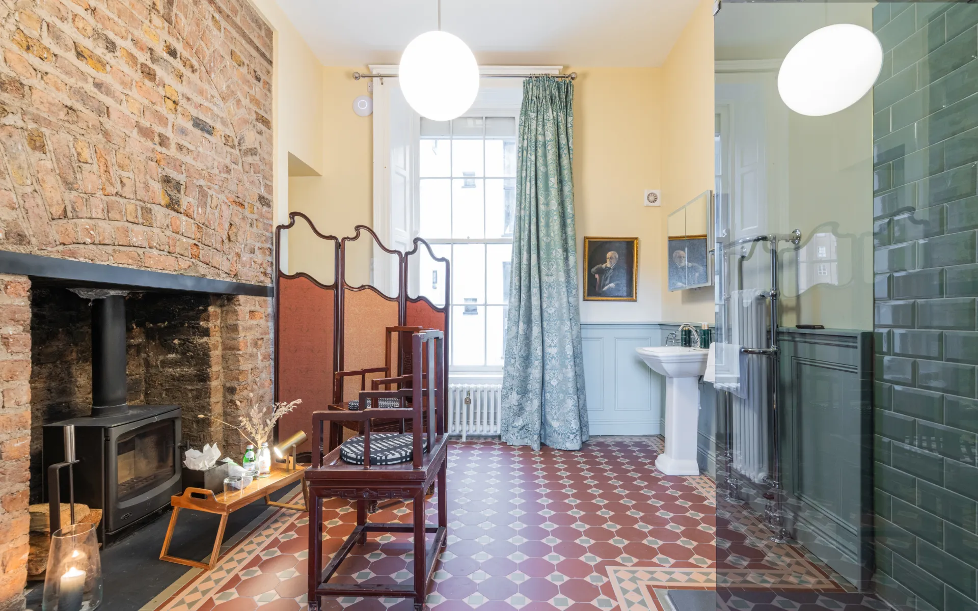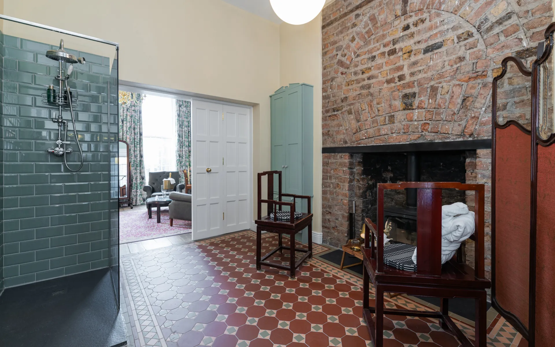 The spacious en-suite bathroom is a standout feature, combining original exposed brickwork with patterned tiles and a modern walk-in shower — a striking contrast of old and new that reflects the story of the building.